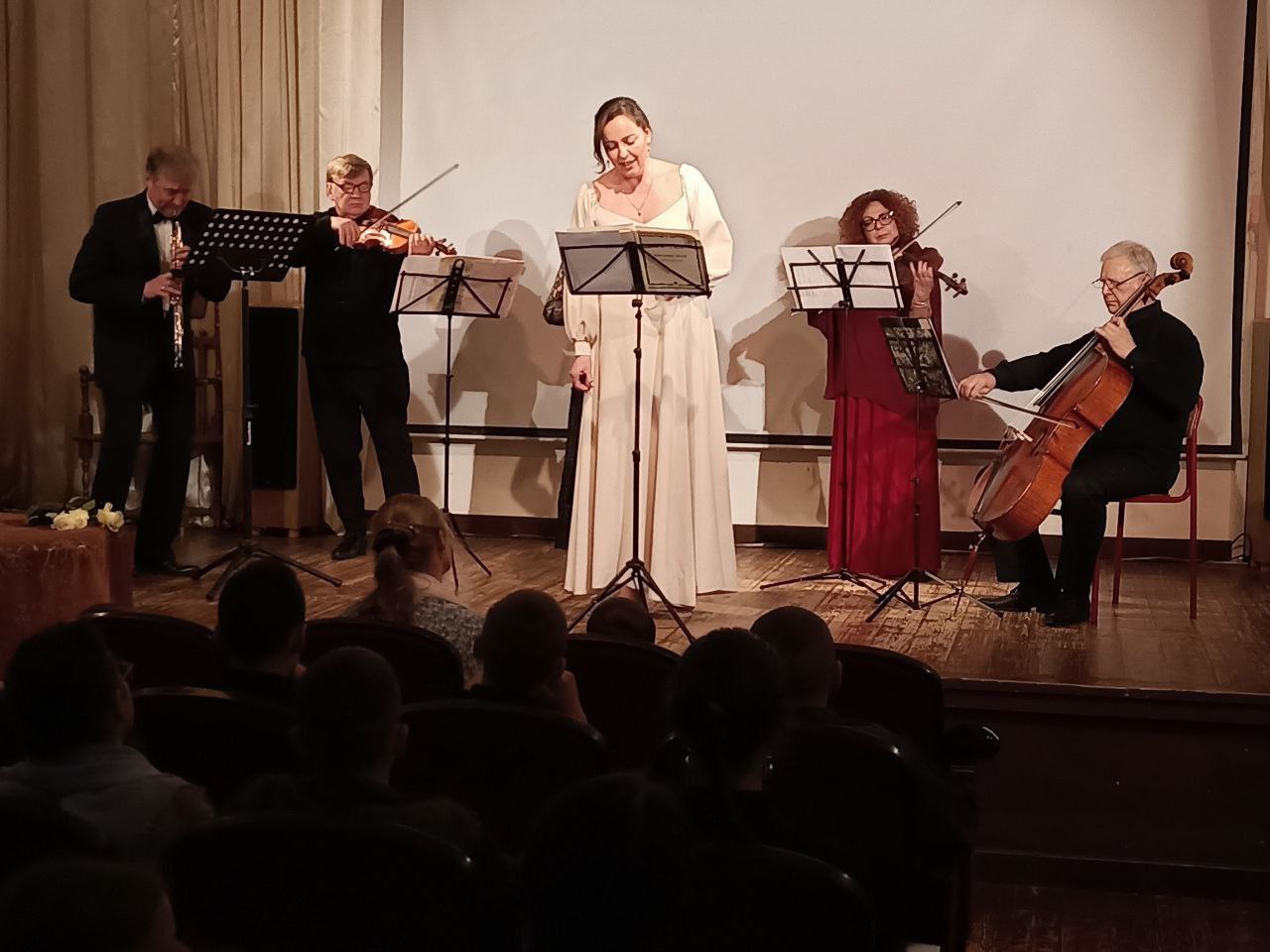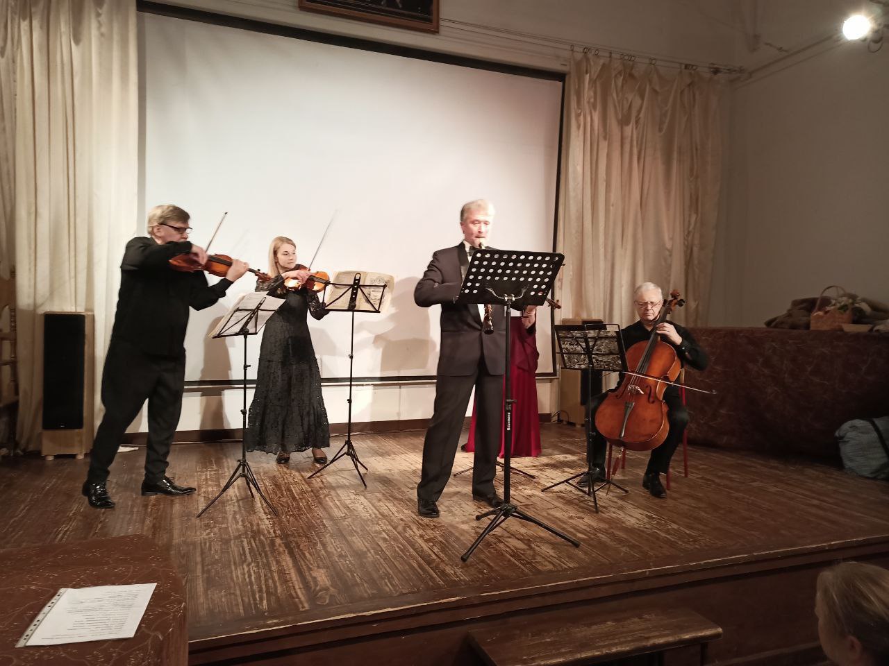 Все музыканты, участвовавшие в концерте многократные лауреаты международных конкурсов: Иван Паисов - гобой, Юлия Макарьянц - меццо-сопрано, Ярослав Красников - скрипка 1 и Анастасия Красникова - скрипка 2, Соломея Протопопова - альт и Заслуженный артист России Виктор Козодов - виолончель. Прозвучали части из Квартетов для струнного состава: Адажио - из ранних сочинения и Аллегро из опуса 18#4- более поздних произведений. И мы услышали разницу письма: одна часть похожа на Венских классиков, другая - собственное, яркое, динамичное лицо настоящего Бетховена, борца, бунтаря, трагика! Очень необычное сочинение - Вариации для гобоя и струнного квартета на тему из оперы Моцарта "Дон Жуан"! И отдельная страница - вокальная музыка Бетховена. Ну, а в заключении был сюрприз: рождественская колядка/щедровка "Ой, на реке Иордан", которая долго сопровождалась аплодисментами зала!