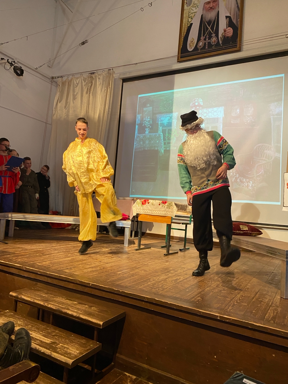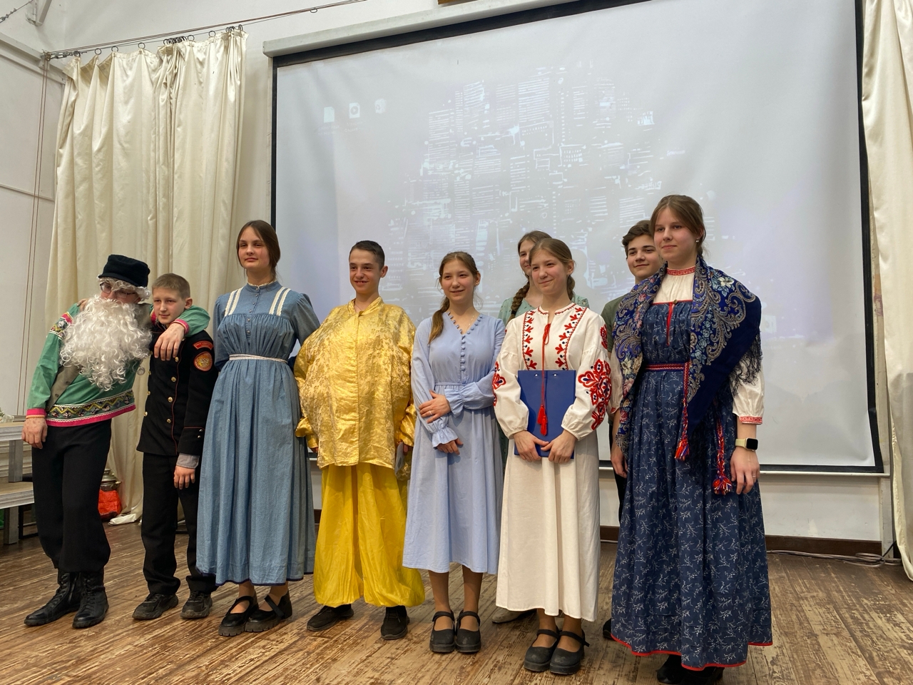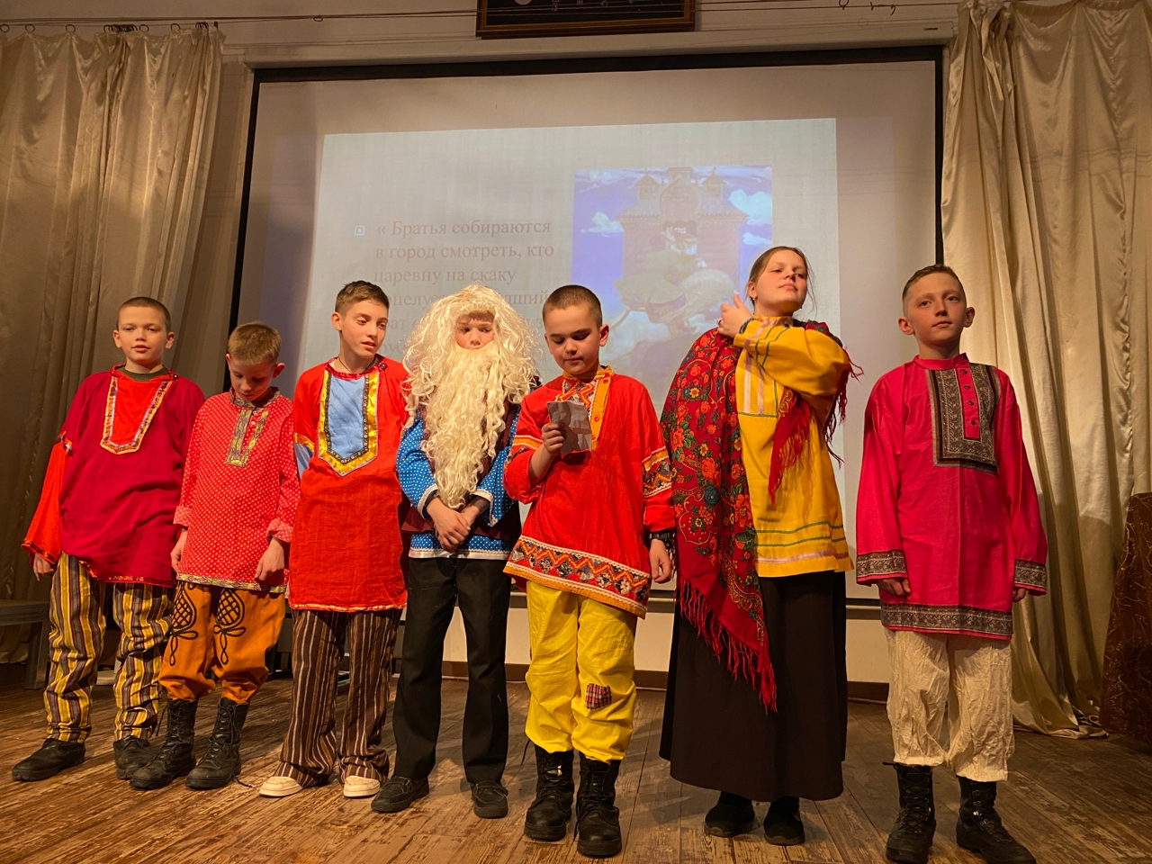 Неделя музеев завершилась ярким событием: выступлением на сцене и презентациями музеев, заданных для каждого класса. В зале собрались ученики, учителя и родители, чтобы посмотреть выступление ребят. Учащиеся 5–6 классов представили музей «Русскую изба»: ребята рассказали о быте крестьян, познакомили с утварью избы. В образах крестьян через сценку рассказывали о главном экспонате в избе - русской печки.