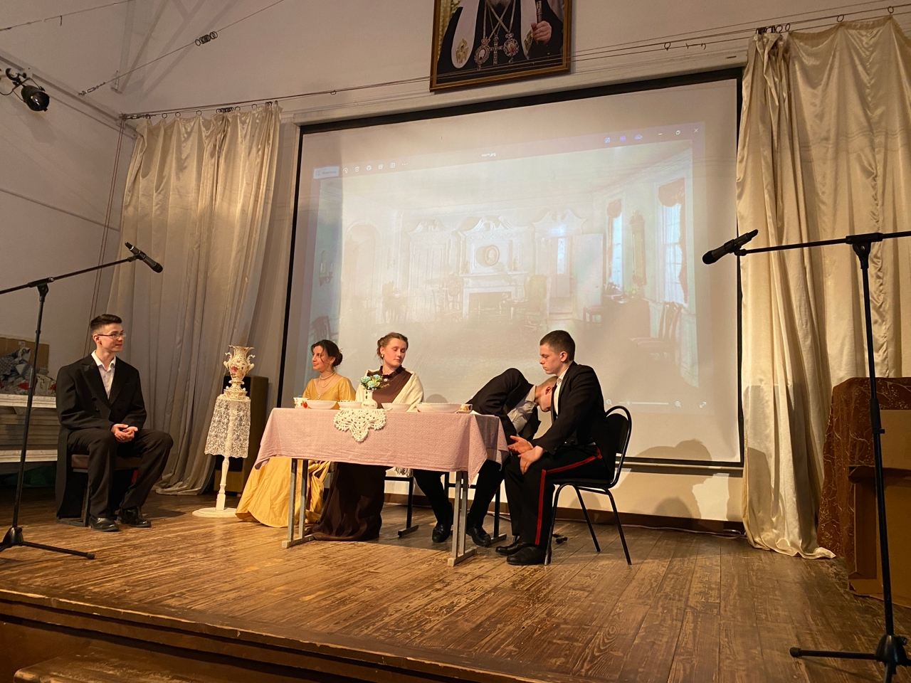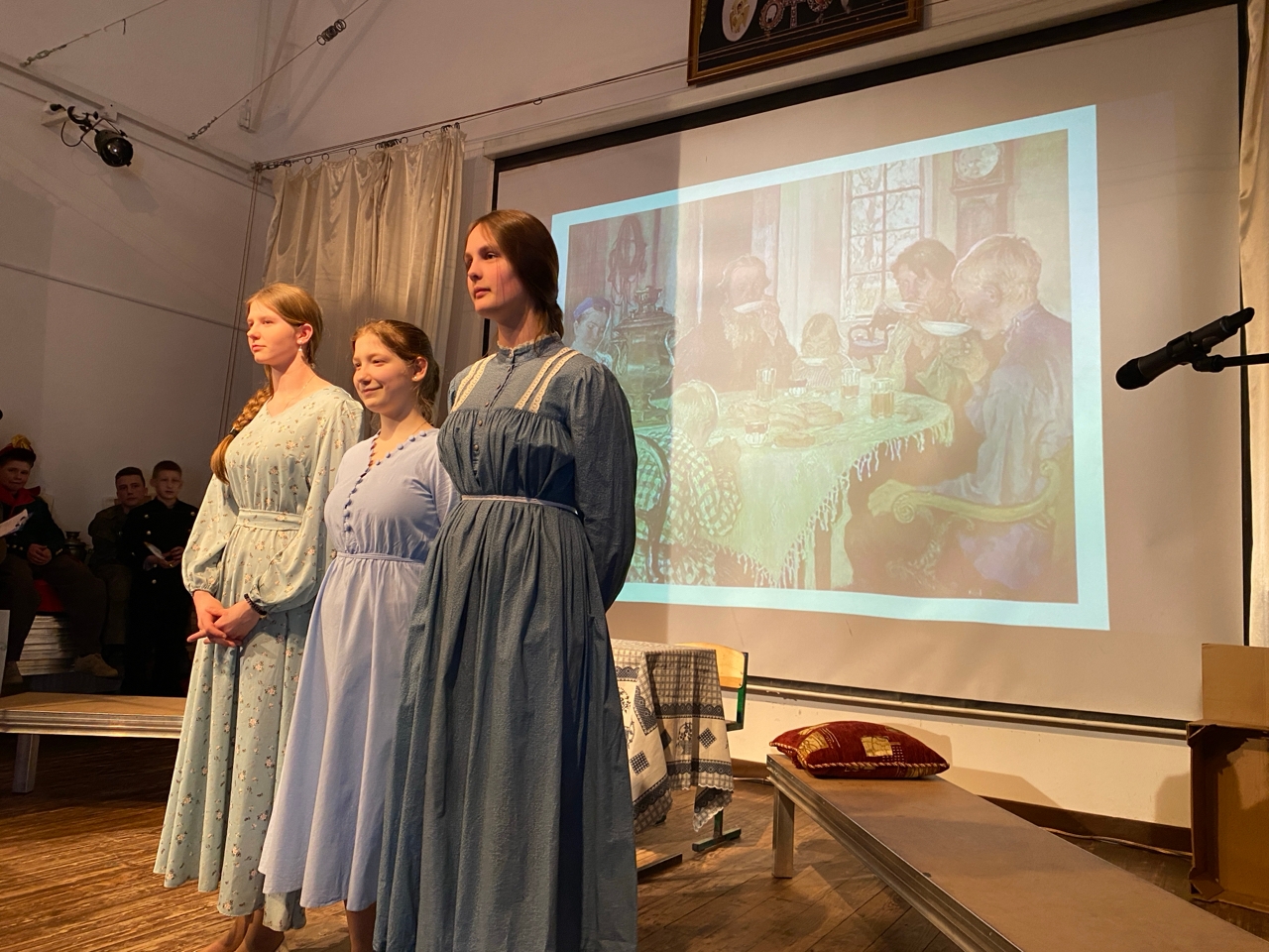 10–11 классы познакомили аудиторию с дворянским бытом и музеями «Гостинная» и «Столовая». Ребята рассказали об этикете приёмов на званых вечерах, продемонстрировали сервировку стола и ряд бытовых предметов дворянской эпохи.